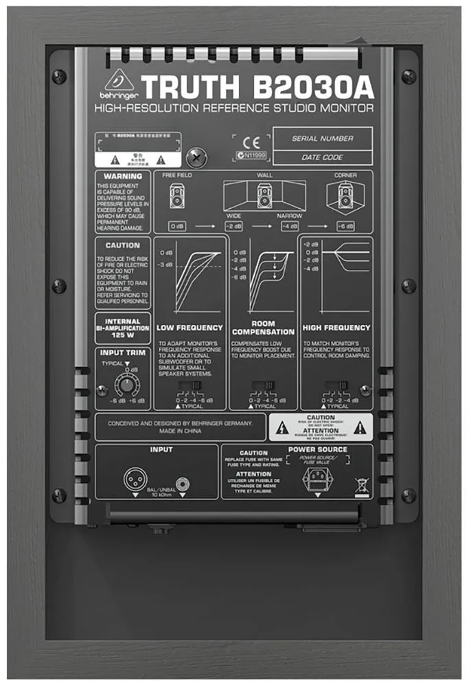 Behringer Truth B2030A – 2-х полосный активный студийный монитор, являются идеальным решением для мониторинга ближнего поля: от небольших микшерных комплексов до многоканальных surround-систем. Несмотря на свои компактные габариты, пиковый уровень звукового давления Truth B2030A может достигать 113 дБ SPL. Питаемые раздельными встроенными усилителями (75 и 35 Вт) с активным кроссовером, эти мониторы обладают ультраровной частотной характеристикой в диапазоне частот от 50 Гц до 21 кГц. Низкочастотный 6-3/4 дюймовый вуфер со специальной полипропиленовой мембраной, закрепленной на цельнолитом алюминиевом шасси, воспроизводит ровный, глубокий бас. Детальная передача кристально чистых высоких частот обеспечивается охлаждаемым ферромагнитной жидкостью ВЧ драйвером с ультравысоким разрешением. Уникальный рассеиватель Behringer и схема кроссовера с минимальным уровнем искажений гарантируют абсолютно ровную фазовую характеристику, великолепную дисперсию и стереопанораму.