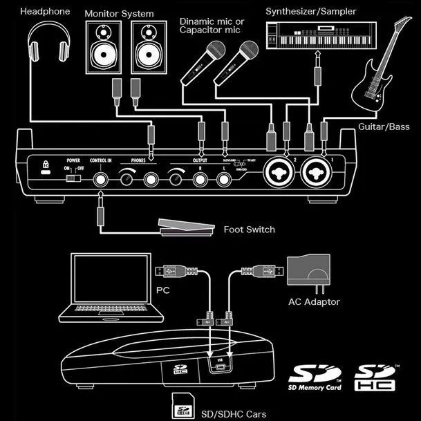 Компания Zoom создала функционально идентичную версию рекордера R24 компактного размера. Как и его предшественник, R8 сочетает в себе четыре устройства в одном. В дополнение к 8-полосному рекордеру с использованием карты памяти SD, R8 – это аудио интерфейс, контроллер для управления ПО и пэд-семплер. Рекордер R8 – это и 8-трековый проигрыватель, и 2-трековый рекордер. Он иделаьно подходит для записи живых выступлений, репетиций и даже звука для видео. R8 воспроизводит до восьми дорожек в формате WAV (24 бит/ 48 кГц). Имеются функции UNDO/REDO для отмены последней выполненной операции и возврата к последней сохранённой версии записи. Также можно делать миксы из уже записанных песен, сохраняя каждый в отдельном проекте. Аудио интерфейс Аудио интерфейс имеет 2 входа и 2 выхода. При подключении к компьютеру посредством USB, R8 становится довольно мощным аудио интерфейсом. Для создания треков можно использовать программное обеспечение Cubase LE, которое входит в комплект. Поддерживается высококачественное 24-бит/96кГц кодирование. При использовании частоты 44,1 кГц доступен встроенный процессор эффектов. Контроллер Помимо управления основными функциями DAW (цифровой рабочей станции), в Zoom R8 также доступно микширование и транспорт-контроль. Zoom R8 оптимален для использования с Cubase, Logic, Sonar и другими секвенсорами. R8 превращает процесс создания треков в удовольствие. Сэмплер Zoom R8 также представляет собой 8-голосный сэмплер с 8-ю пэдами. Предусмотрена игра “в реальном времени”, а также запись с удобной волнообразной визуализацией лупов (“петель”). Есть возможность изменения темпа без обрезки незаконченных лупов. Функции сэмплера и рекордера могут использоваться одновременно. Создайте свой уникальный бит, используя R8 в качестве драм-машины, которая включает 10 типов ударных. Сенсорные пэды помогут создать до 511 уникальных битов, а примеры ритмических рисунков с лёгкостью можно использовать в качестве лупов (“петель”). Используйте пэды для воспроизведения примеров ударных партий, а секвенсор для сложения их в песни. Вы можете начать с одного из 472-х уже имеющихся ритмических примеров. Встроенные высокочувствительные стерео микрофоны удобны для записи музыкальных скетчей и спонтанно сочинённых мелодий, а также оптимально подойдут для записи вокала и акустических инструментов. Более 140 эффектов и 370 пресетов могут быть использованы для записи, микширования и сведения конечного трека. Пакет эффектов содержит 7 модулей и включает ряд алгоритмов для гитар, баса, вокала и не только. Один встроенный эффект может быть одновременно использован с “send-return” эффектами двух типов. Также включены 18 типов эмуляции гитарных и 6 типов эмуляции басовых усилителей, что поможет вам воссоздать реалистичное звучание, всего лишь подключив электрогитару или бас-гитару к R8. Портастудия Zoom R8 поддерживает компактные SD и SDHC карты объёмом до 32 Гб. Отказ от использования традиционных жёстких дисков не только делает устройство гораздо мобильнее, но и обеспечивает ему повышенную надежность и отсутствие риска сбоя жесткого диска. R8 также предлагает вам возможность установки до 100 регулируемых маркеров, функцию повторения интервала A-B для проигрывания или перезаписи выбранного интервала, а также ряд других необходимых функций, которые значительно упрощают редактирование. Передача данн